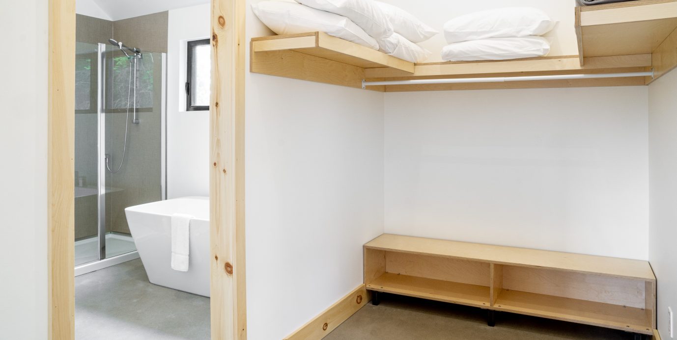 L’espace loft comprend une chambre principale avec salle de bain privée et trois lits escamotables dans la partie à aire ouverte. Deux chambres privatives avec leur salle de bain privée sont comprises dans la location du chalet entier.